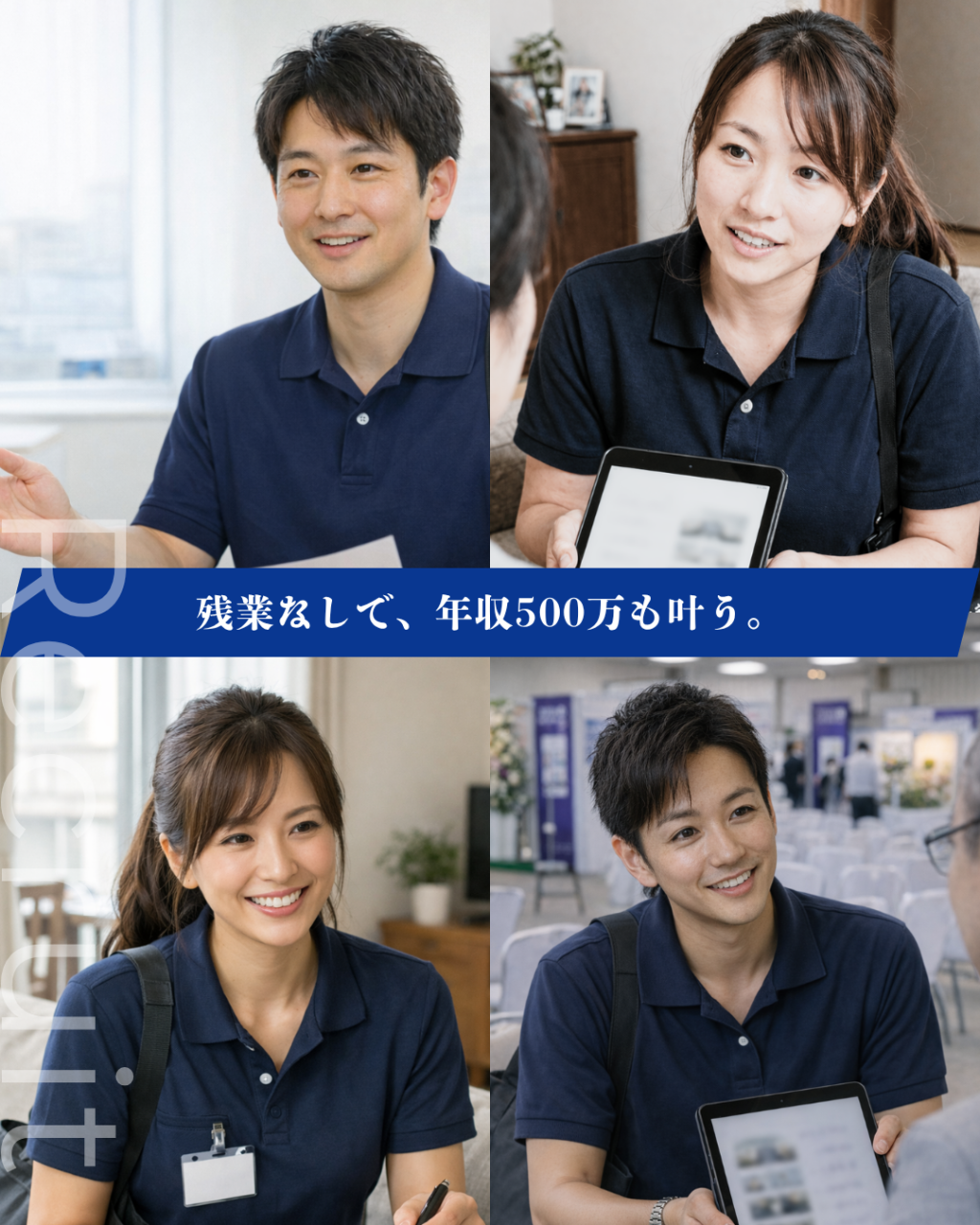 | 手当 | 保障手当:100,000円/月 車両手当:12,000円/月 通勤手当:2,100円/月~(規定による) ※月25口契約のノルマあり |